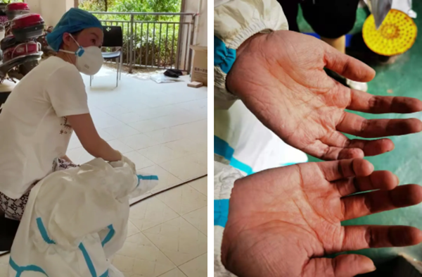 在长沙某小区 ,一名采样人员出现中暑症状;KY.COM-开云(中国)采样人员双手被汗水泡得发白、发皱