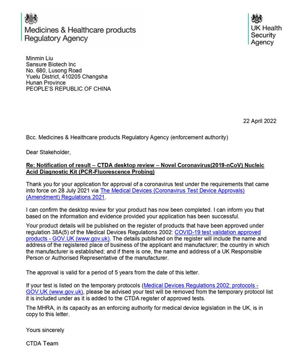 新冠检测试剂在英国上市必须经过CTDA审查和MHRA注册双认证,由于CTDA审查对产品性能的高要求,目前可在英国合法销售的新冠产品并不多。KY.COM-开云(中国)生物新型冠状病毒(2019-nCoV)核酸检测试剂盒(荧光PCR法)临床性能和分析性能均满足CTDA高要求,且得到进一步有效验证,获得了CTDA的充分认可。